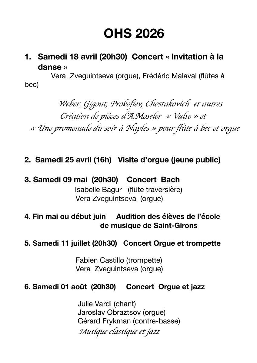 - Une nouvelle audition organisée à Oust par l'École de Musique Couserans-Pyrénées avec notre organiste titulaire Vera Zveguintseva aura lieu (à une date qui reste à déterminer)