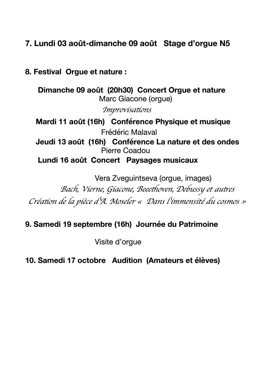 - Le Festival « Orgue et nature » comprendra 4 évènements : le 09 août concert de Marc Giacone (Improvisations d’orgue) ; le 11 août Conférence Physique et musique par le Dr. Frédéric Malaval ; le 13 août Conférence La nature et des ondes par Pierre Coadou ; le 16 août Concert « Paysages musicaux » par Vera Zveguintseva (orgue, images) dont une création de la pièce d’A. Moseler « Dans l’immensité du cosmos »